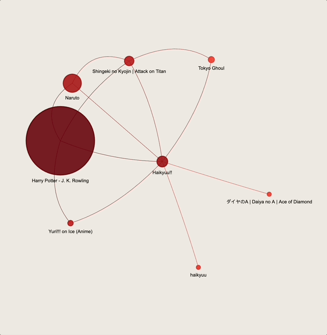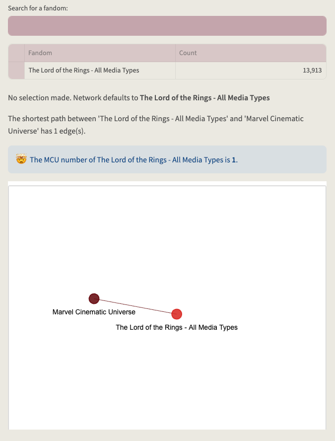 This even allows interactivity! You can search for fandoms you're interested in, see the count of works on AO3, choose one, set the range of the number of neighboring nodes you'd like to see, and see the graph change!